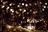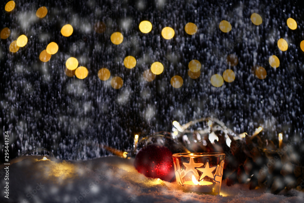christmas theme with candles, snow, .pinecone and christmas light with pokeh effect