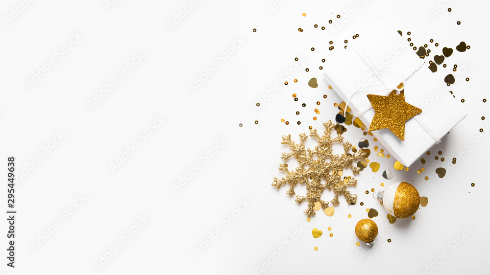 Merry Christmas and Happy Holidays greeting card. New Year. Golden ornaments on white background top view. Winter holidays.