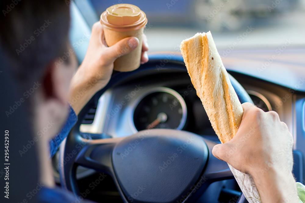 Driver is eating baguette and drinking coffee behind steering wheel of car. Young man is not attentively driving automobile. Guy is breaking rules of road. Concept of fast rhythm in modern city.