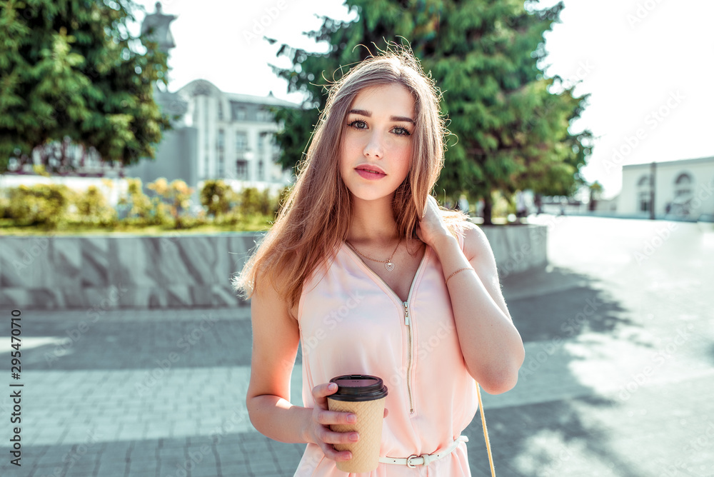 Beautiful girl in summer in city a pink dress, hand in a cup with coffee, long hair, bright sunny day, cup with coffee tea. Everyday makeup. Emotions of calm comfort and pleasure.