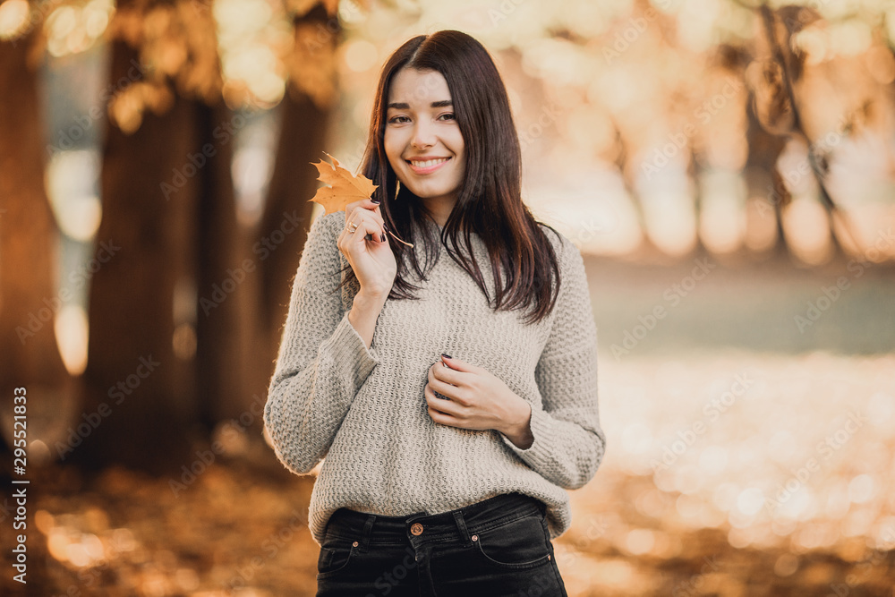 Beautiful woman posing for the camera with autumn leaf. Happy Autumn.
