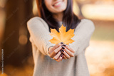 Beautiful woman posing for the camera with autumn leaf. Happy Autumn.