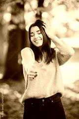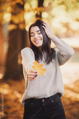 Beautiful woman posing for the camera with autumn leaf. Happy Autumn.
