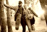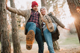 Traveler couple show boots and having fun in highlands. Freedom and active lifestyle concept.