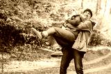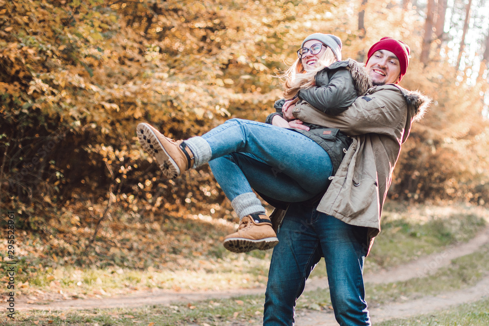 Traveler couple in love so fun in the forest. Concept of trekking, adventure and seasonal vacation.