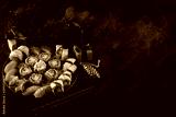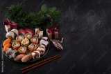 Assorted sushi sashimi set with salmon, tuna and eel on dark slate background with decorations. Christmas or New Year background. Tree branch with gifts. Traditional japanese food. Copy space for text