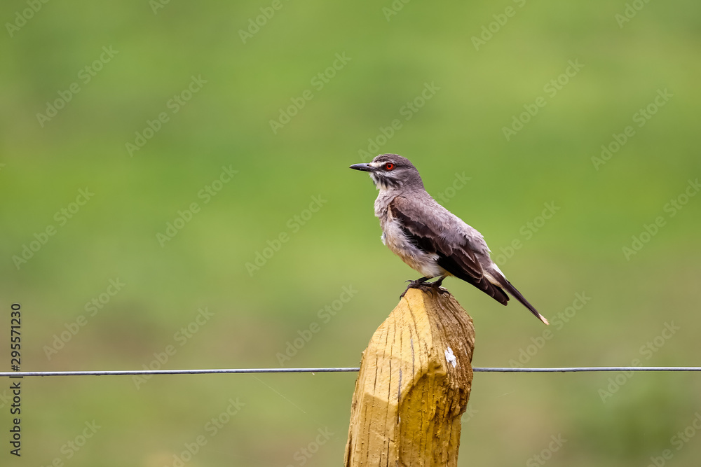Grey Monjita perched on a wooden post, looking for food against defocused background, Pantanal Wetlands, Mato Grosso, Brazil
