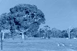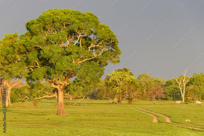 Typical meadow and forest landscape in the Pantanal Wetlands, green grass and warm sunlight, Mato Grosso, Brazil