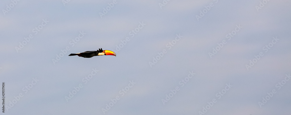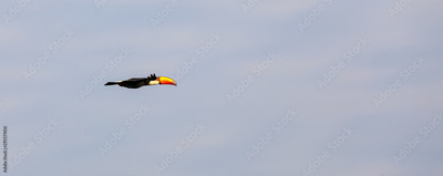 Toco Toucan in flight against bright sky, Pantanal Wetlands, Mato Grosso, Brazil
