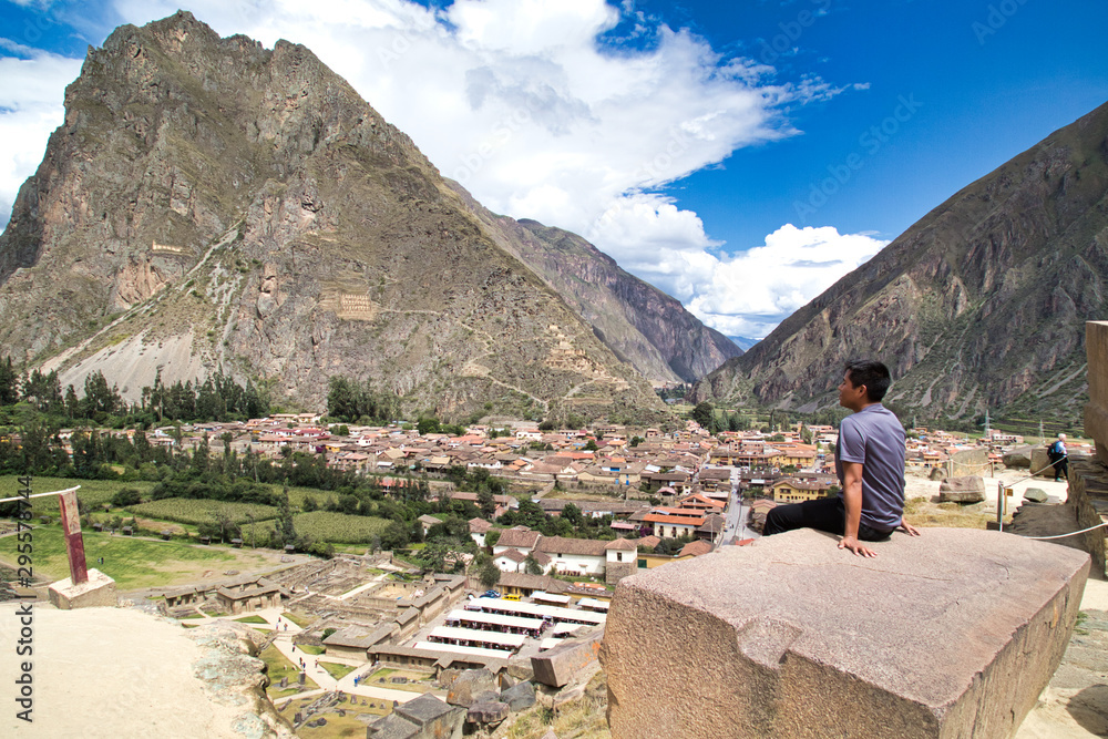 Tourist observing the city with a panoramic view in Ollantaytambo is a town in the Sacred Valley of Peru, which lies south on the Urubamba River and is surrounded by snow-capped mountains.