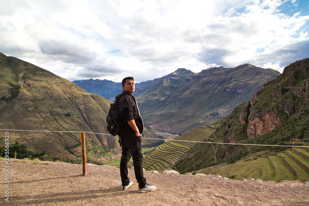 Man panoramic view Moray maras archeological site in Peru.
