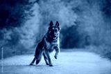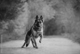 portrait of beautiful young long haired female german shepherd dog running fast on the road in daytime in autumn