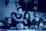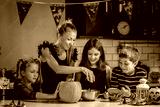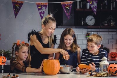 Mother carving Halloween pumpkin with children at decorated home kitchen