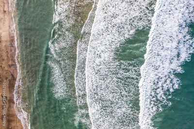 Aerial view of sandy beach with tourists swimming in beautiful clear sea water