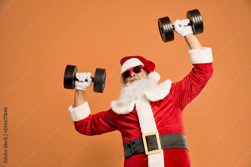 Funny bearded man in Santa costume with dumbbells above head