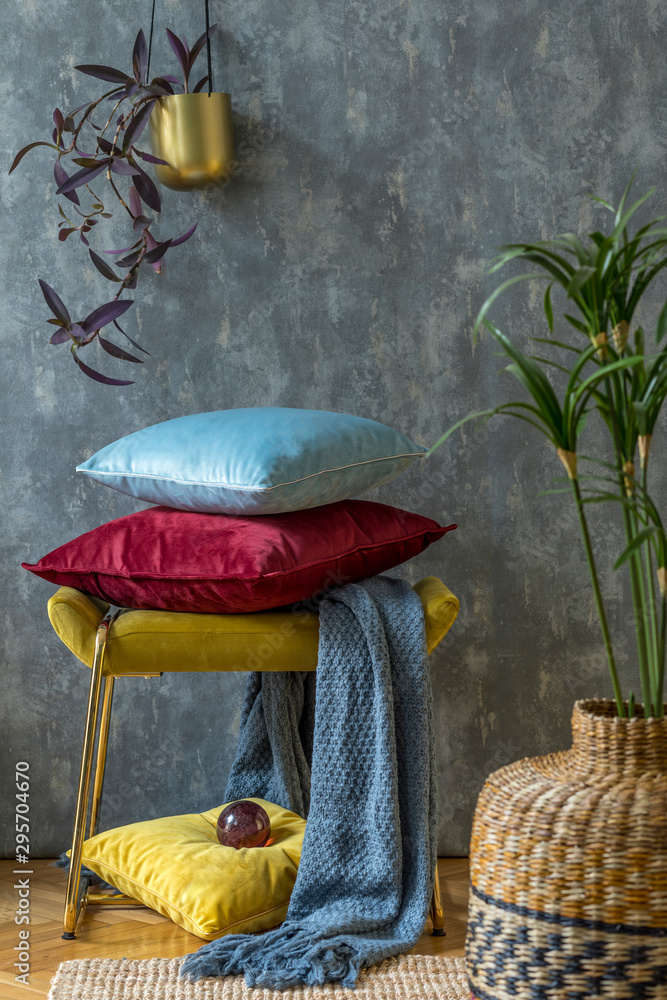 Stylish and luxury living room of apartment with gold bench, velur pillows, etno vase with flowers, glassy ball and elegant personal accessoreis. Modern home decor. Interior design. Template.