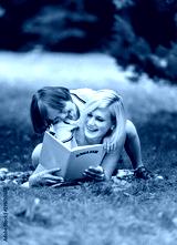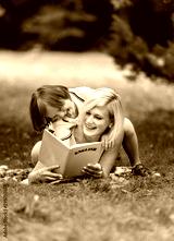 Mother and son playing fools while reading on a rug amidst a summer park lawn