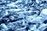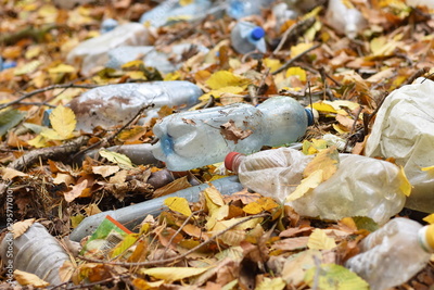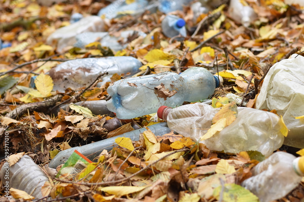 Plastic bottles and garbage left in autumn forest after picnics. Pollution of nature. Ecological problems concept.