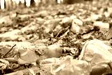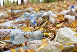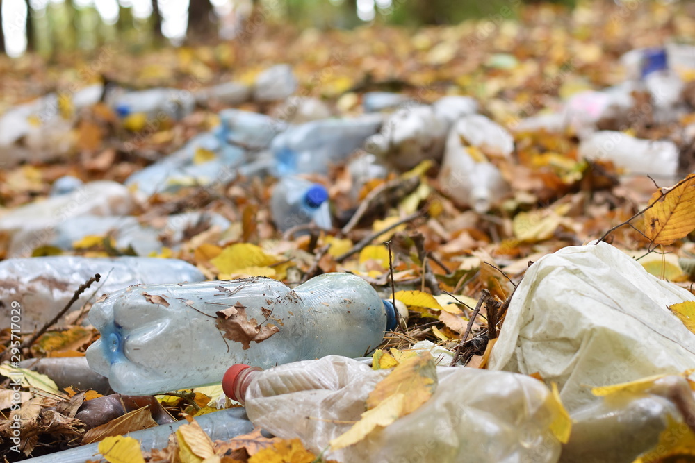 Plastic bottles and garbage left in autumn forest after picnics. Pollution of nature. Ecological problems concept.