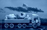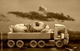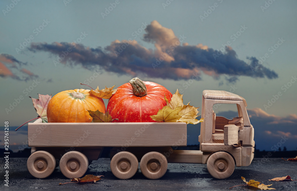 Halloween background, orange pumpkins and dry maple leaves in wooden toy truck. Evening sky with clouds, sunset. Wooden surface, studio shot , poster.
