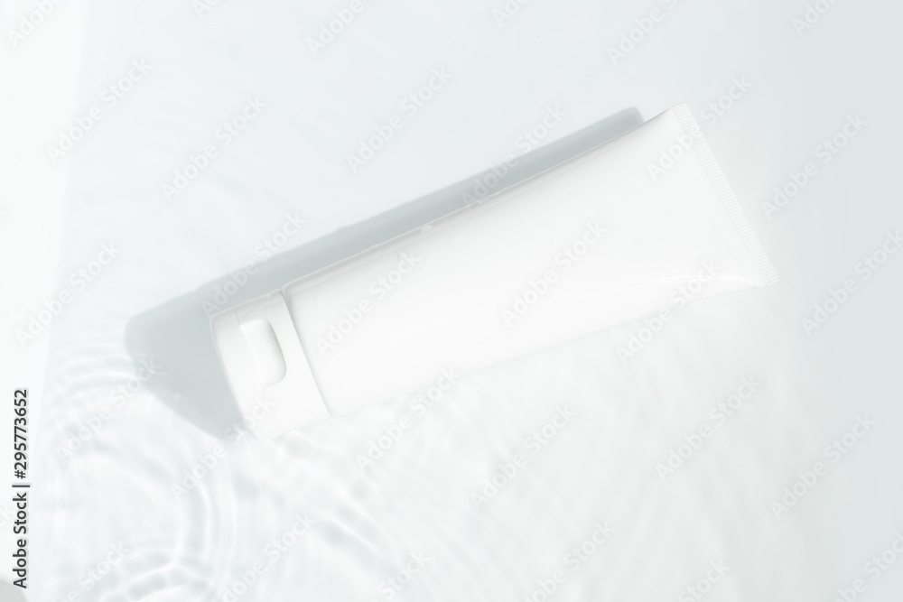 fresh beauty spa medical skincare and cosmetic lotion cream spray bottle packaging product on white decor background with summer season sun light