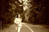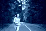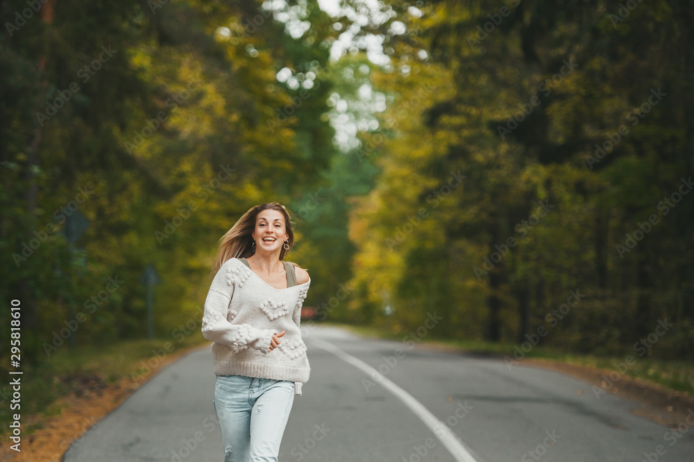 Happy woman in jeans is runnning on asphalt road in autumn forest