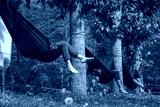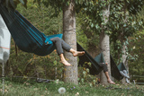 Friends relaxing in hammocks tied to the trees of a campsite on a sunny day.