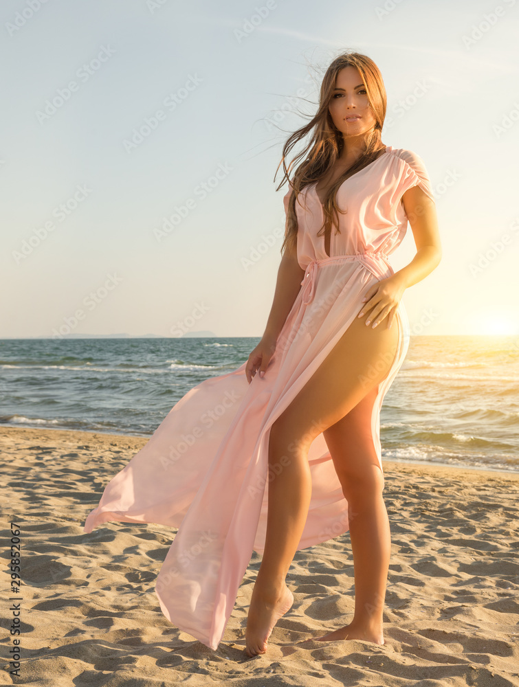 Young beautiful girl on the beach at sunset