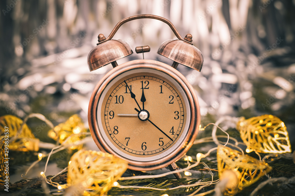 Close up of retro alarm clock on blurred Christmas background with bokeh