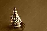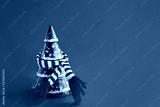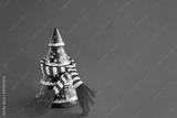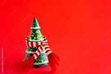Minimalistic Christmas tree made of evergreen fir plant on red background. Christmas, new year concept. Flat lay,
