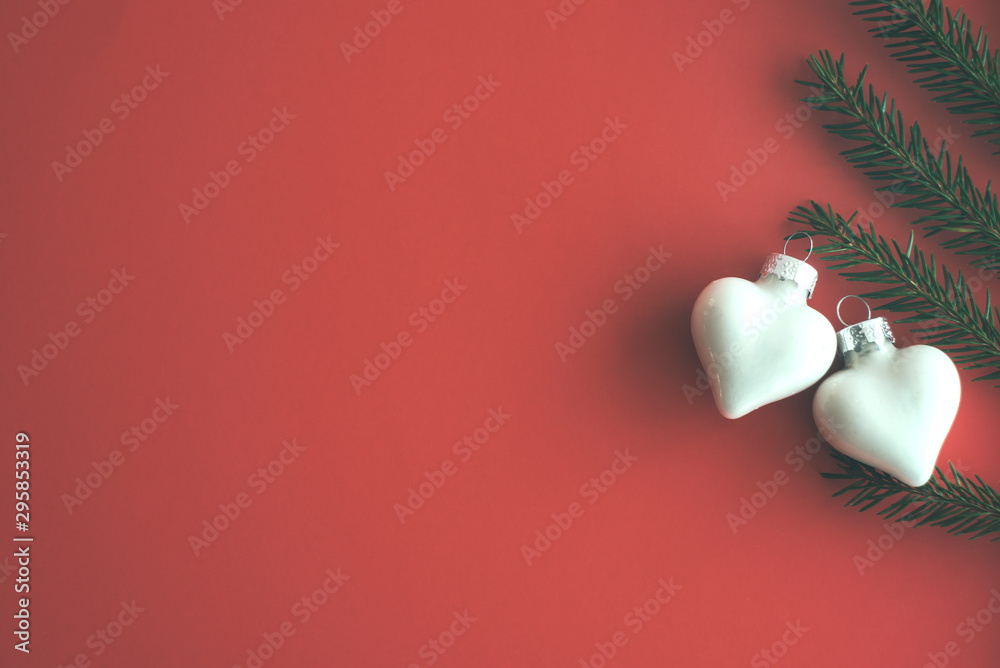 Art Christmas Greeting Card. Christmas tree white glass toys two hearts and natural fir branch of spruce on red paper.