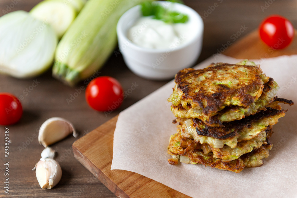 zucchini pancakes with sour cream on a Board, cherry tomatoes, garlic, fresh zucchini