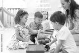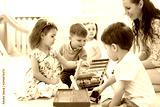 Kindergarten teacher and kids playing with abacus sitting on the floor in daycare