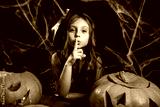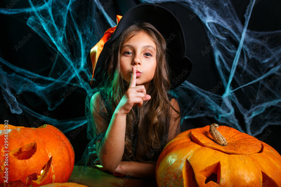 Halloween Concept - little girl in witch costume celebrating Halloween doing silence gesture posing with curved pumpkins