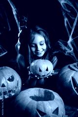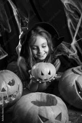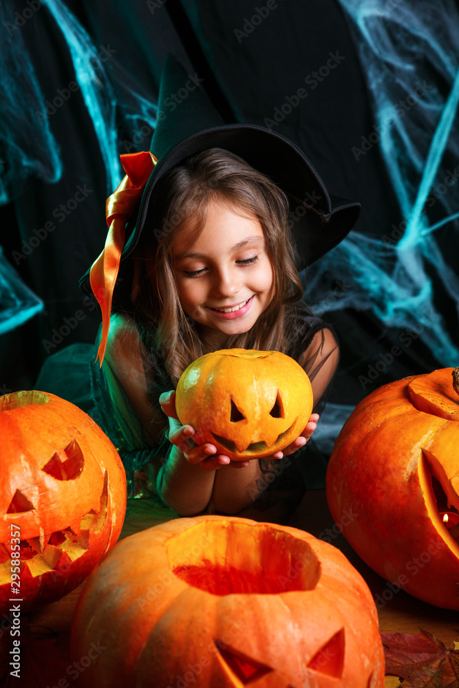 Happy halloween. Cute little girl in witch costume with carving pumpkin. Happy family preparing for Halloween.