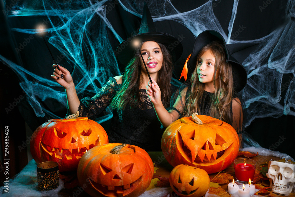 Happy Halloween . Beautiful caucasian mother and her daughter in witch costumes enjoy using magic with magic wand