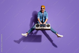 Full length body size photo of screaming cheerful handsome attractive music lover shouting with having won retro recorder wearing jeans jacket brown cap headwear isolated over purple vivid color