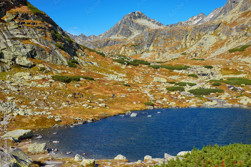 Beautiful lake over Skok wterfall - Skokom pleso in vibrant blue among peaks of High Tatra mountains