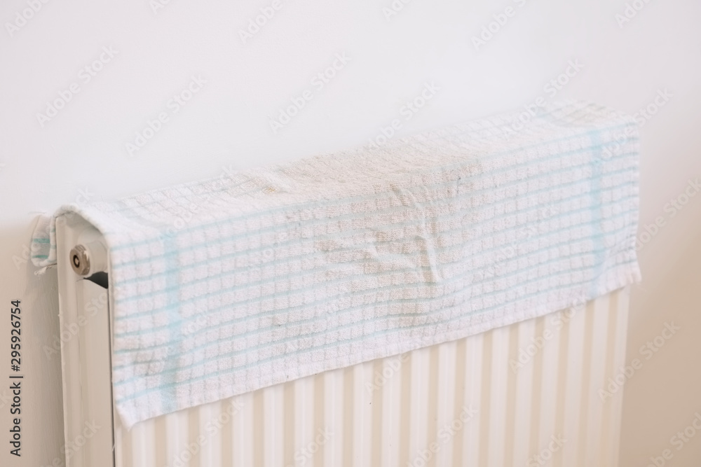 Dirty tea towel on radiator in kitchen