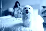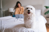 beautiful woman working on laptop at home on bed. Cute small maltese dog besides. Lifestyle