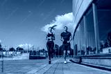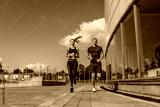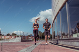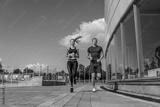 Athletic couple man woman, summer in city, jogging in jump, free space for text motivation fitness and workout, sportswear. Background tile and glass windows.
