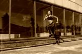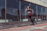 Sport girl runs summer city. Sportswear Leggings Top. Background showcase glass windows. Motivation fitness workout lifestyle. Free space text. Tanned slender figure jump strong bold confident woman.