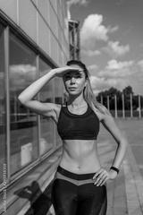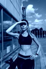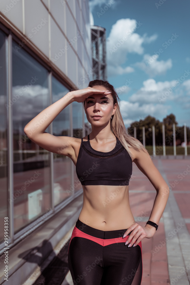 athlete girl in summer in city looks into distance, covering her hand from bright sun. Workout before morning jogging, fitness outdoor workout. Tanned slim figure, motivation woman lifestyle.