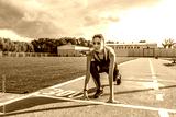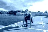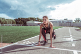 Athletic woman stands start of sports stadium before jogging, training in summer in city. Sportswear Leggings Top. Motivation for fitness and workout lifestyle. Free space for text.