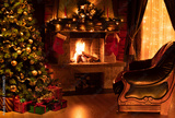 Christmas decorated interior with fireplace, armchair, window and tree