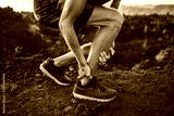 Achilles injury on running outdoors. Man holding Achilles tendon by hands close-up and suffering with pain. Sprain ligament or Achilles tendonitis.