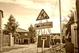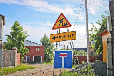 Road sign road repair, no driveway, with the inscription in Russian "Detour". In a village under construction