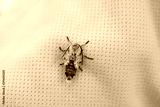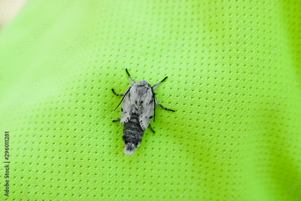 Butterfly pest plants. Shaggy white butterfly with undeveloped wings on a background of light green fabric.
