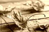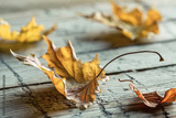 Detailed close-up view of dry maple leaves in autumn. A wooden rustic background.