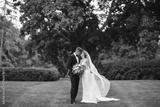 Beautiful bride in a long white dress. Handsome groom in a black suit. Couple in a summer park
